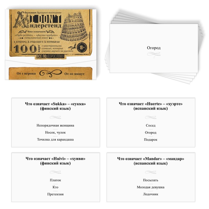 Встречайте продолжение легендарной викторины! На одной стороне карточки написано иностранное слово, которое смешно звучит по-русски, а на другой — 3 варианта его толкования. Правильный только один, его игрок и должен определить. Чтобы проверить себя или другого участника, просто переверните карту.