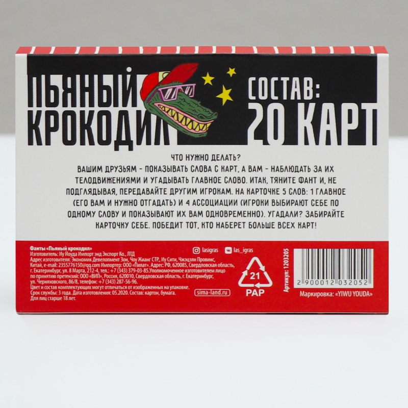 «Крокодил» — любимая игра поколений! В этот набор добавили немного алкоголя, и крокодил стал не совсем трезв, а значит, и правила изменились. Они стали необычными и ещё более весёлыми. Собирайте компанию друзей и скорее проверяйте это на деле!