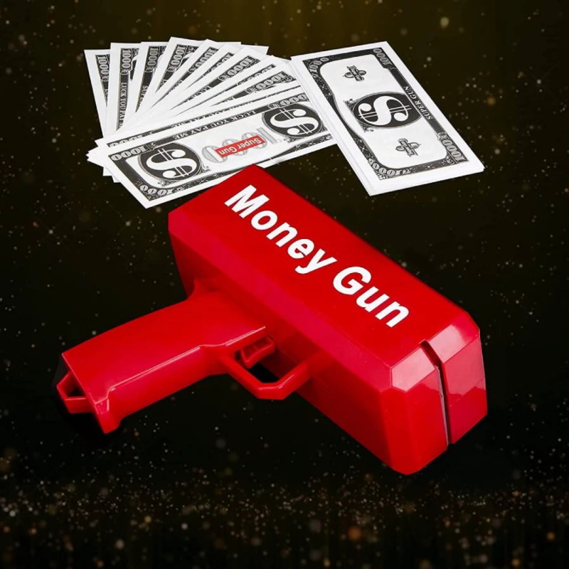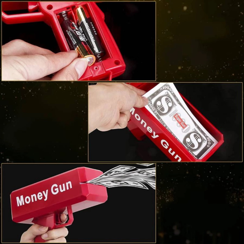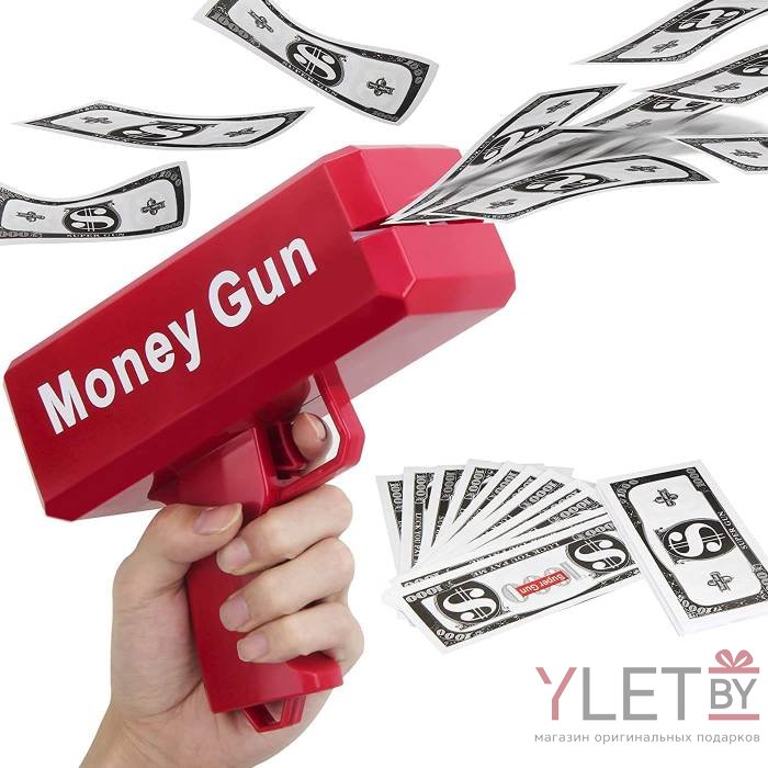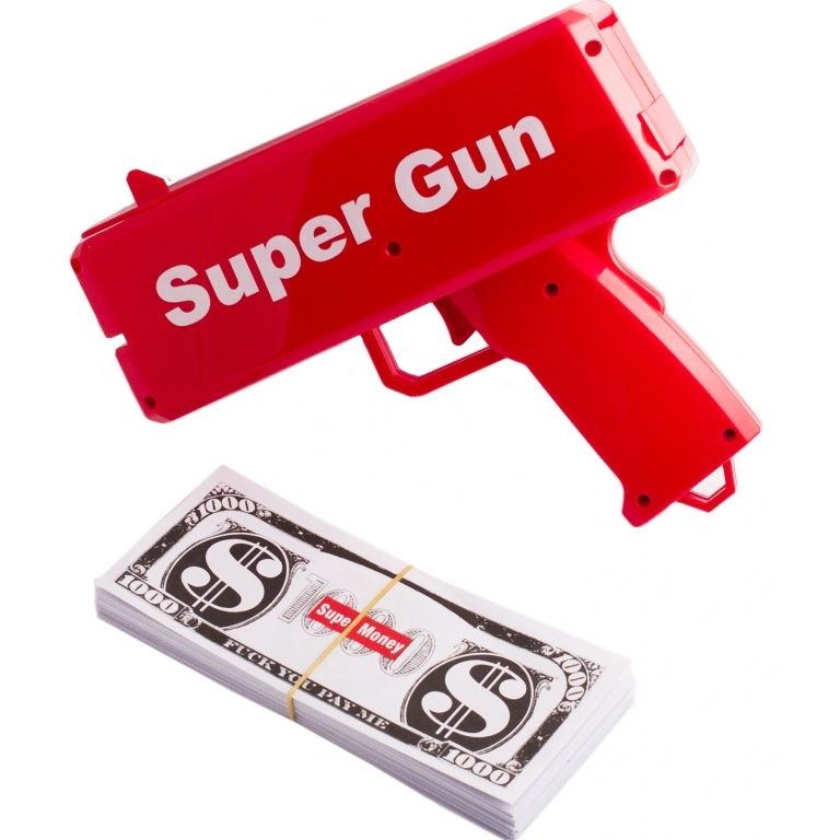 Пистолет, стреляющий деньгами поможет утвердиться в собственной крутости и порадует не только своего владельца, но и всех вокруг. Яркий красный деньгомет не останется незамеченным ни на одном празднике или вечеринке. Внутри устройства закреплено резиновое колесико, приводом для него служит небольшой мотор. Под его влиянием колесико вращается и перемещает вложенные в слот пистолета денежные купюры или их заменители. В комплекте с деньгометом вы получите пачку ненастоящих купюр.