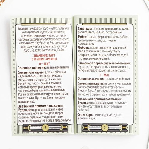 В инструкциях к картам вы найдёте подробное описание и толкование каждой карты, а также популярные расклады. В комплекте также есть мешочек для хранения, чётки и свеча для создания необходимой атмосферы.