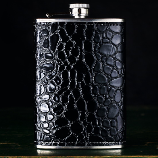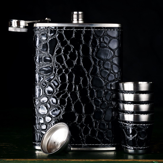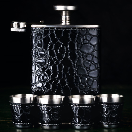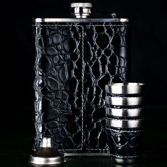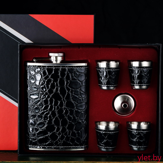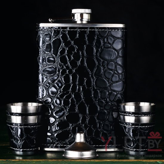 Набор с фляжкой и стопками под кожу Крокодил черный в окантовке