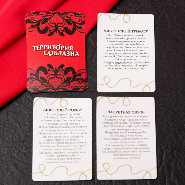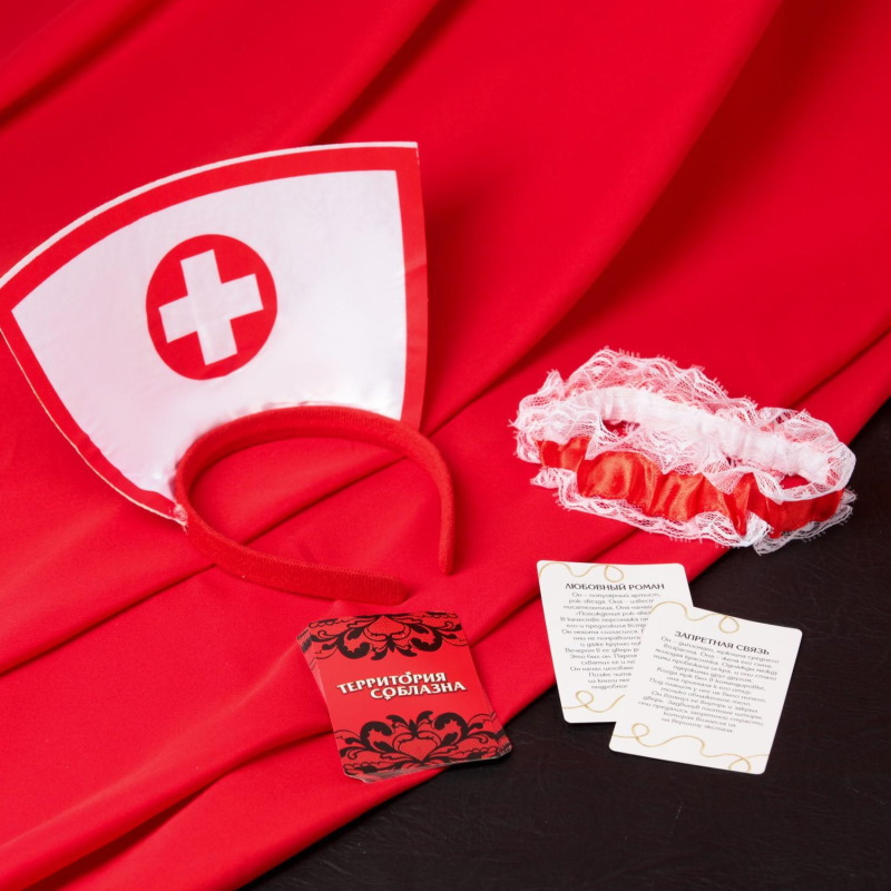 Внутри вас ждут 10 карточек с горячими сценариями ролевых игр. Изучите карточки, выберите подходящие и воплотите написанное в жизнь. Партнёрша может использовать ободок медсестры и подвязку, чтобы добавить образу перчинки.