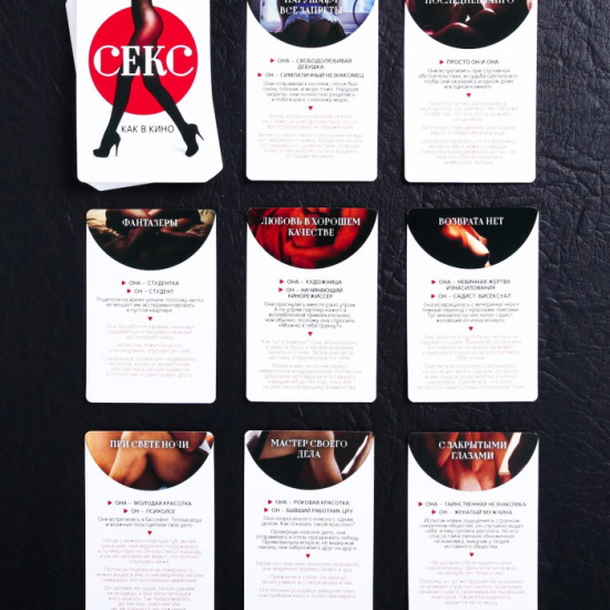 Вы можете вытянуть случайную карту или выбрать из имеющихся. На каждой карте представлен сценарий встречи героев и описана постельная сцена из знаменитого фильма.