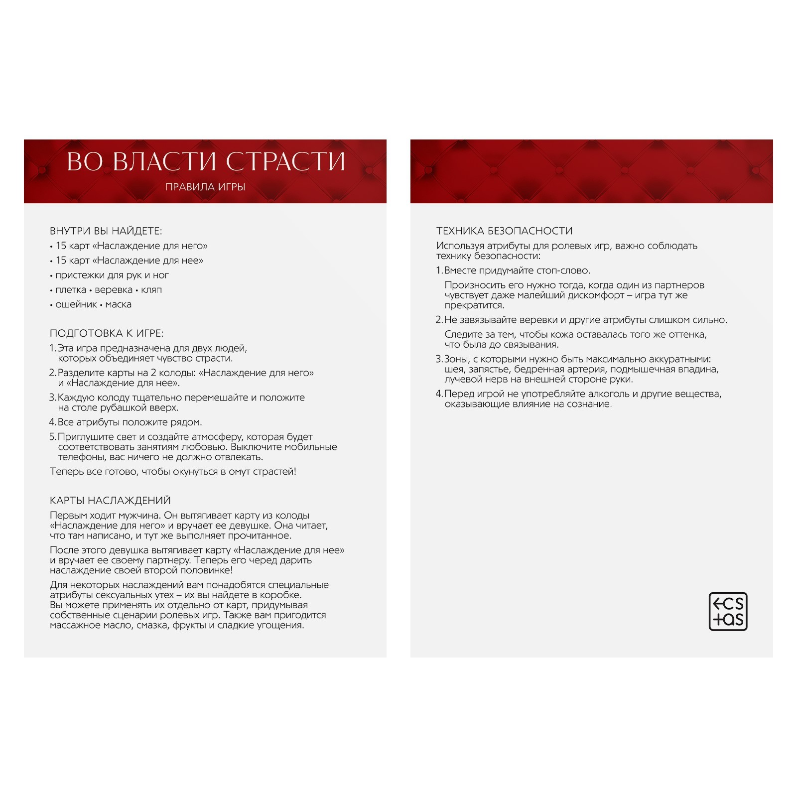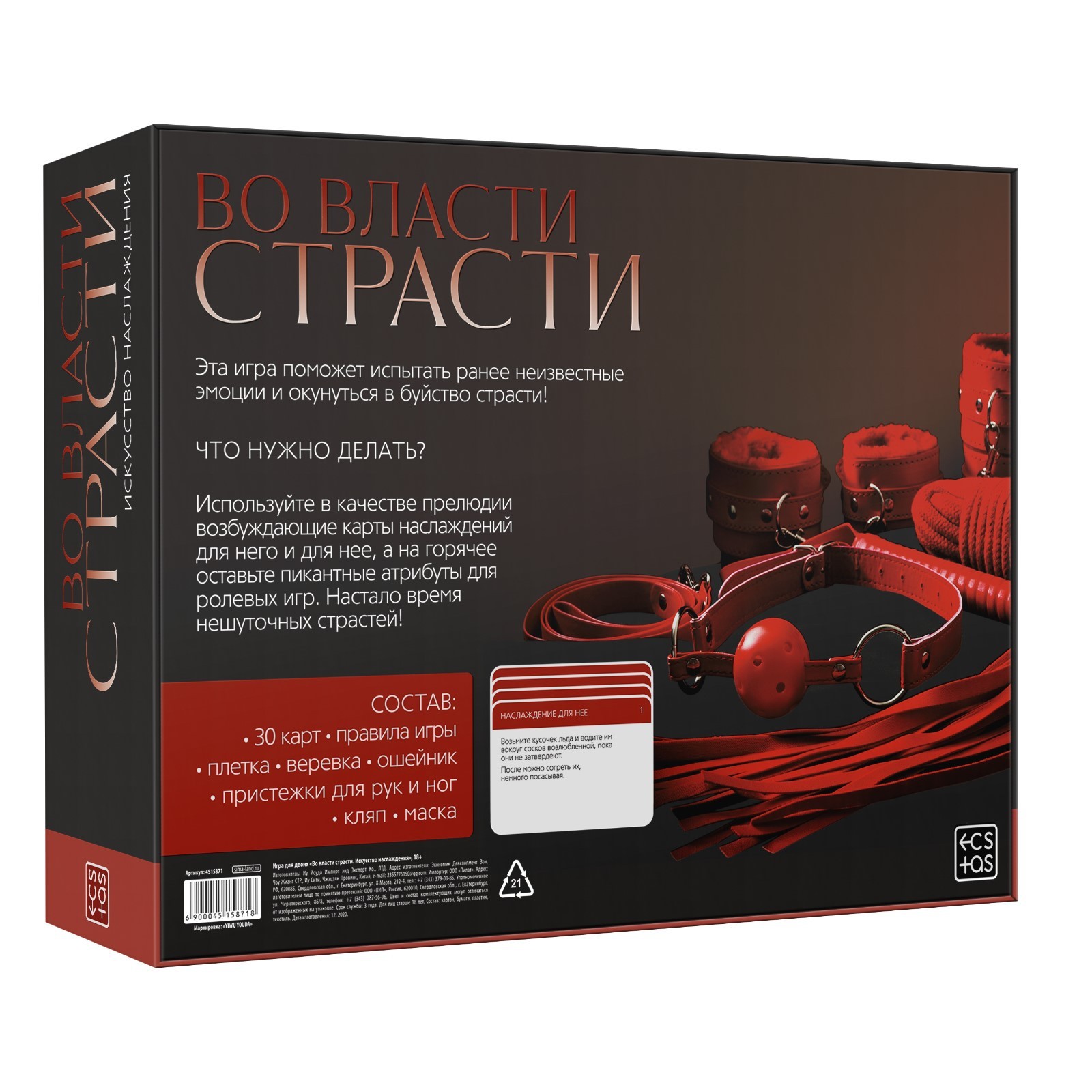 Игра для пар «Во власти страсти. Искусство наслаждения», 7 в 1 (30 карт, веревка, маска, кляп, плётка, ошейник, пристежки для рук и ног), 18+