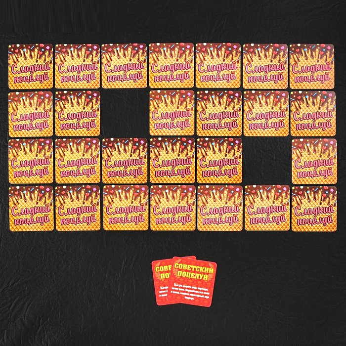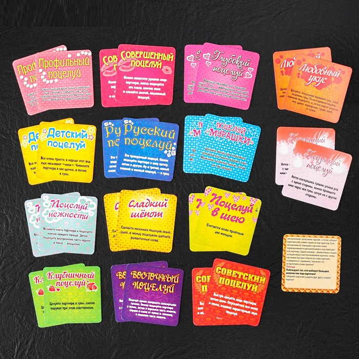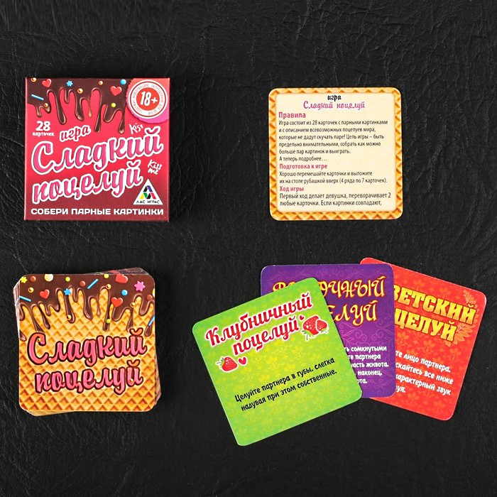 Очень просто! Для начала разложите карточки рубашкой вверх в четыре ряда, затем переворачивайте по очереди две карточки. Если карточки совпали, заберите их себе, прочитайте вид поцелуя и инструкцию, а затем приступайте к тренировке с любимым человеком. Если карточки не совпали, тогда передайте ход второй половинке.