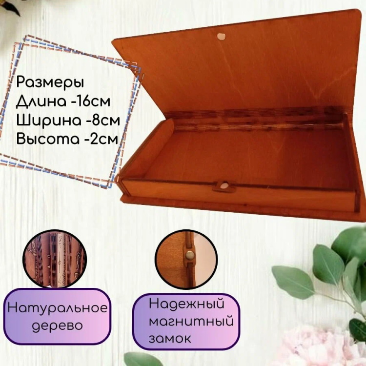 Деревянная купюрница для хранения банкнот. Основа сделана из фанеры на поверхности нанесена надпись "На Женские радости". Купюрница легко открывается и закрывается за счет надежного магнита. В конверте шкатулке удобно дарить деньги. Поможет выделиться на торжественном событии