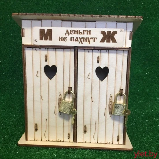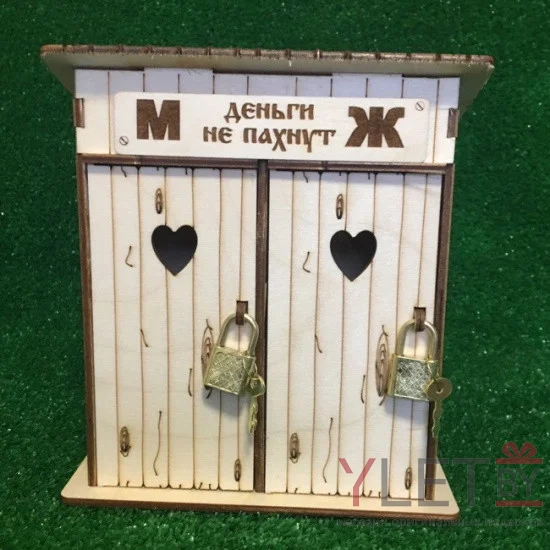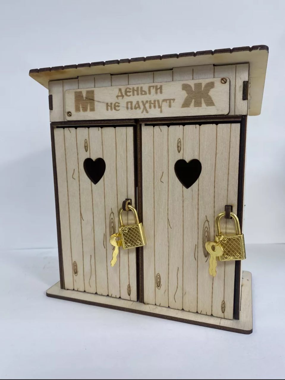 Представляем вам оригинальную деревянную копилку "Двойной туалет" с забавной надписью "Деньги не пахнут"! Этот уникальный аксессуар станет отличным дополнением вашего интерьера и поднимет настроение каждому, кто его увидит.