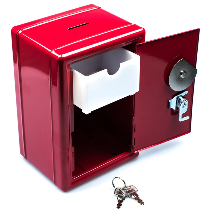Настоящий металлический сейф, только небольшого размера. Такой можно поставить на стол или спрятать в шкаф и складывать в него выручку, не открывая дверцу. Открыть ее лишь тогда, когда накопится нужная сумма.