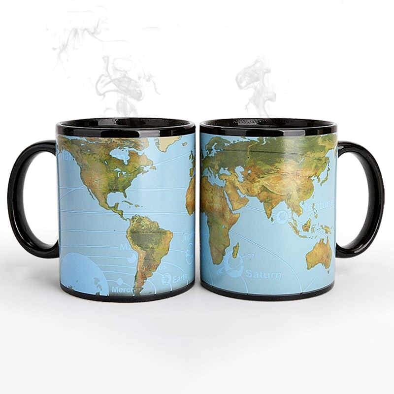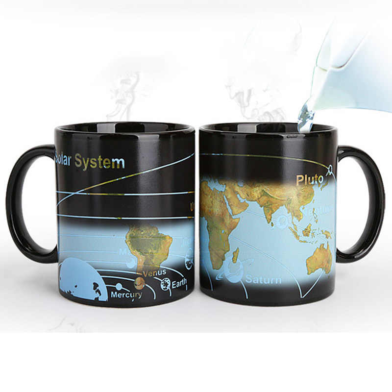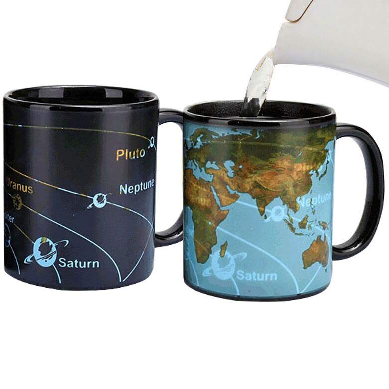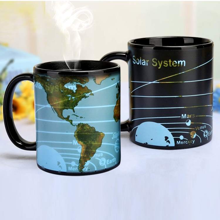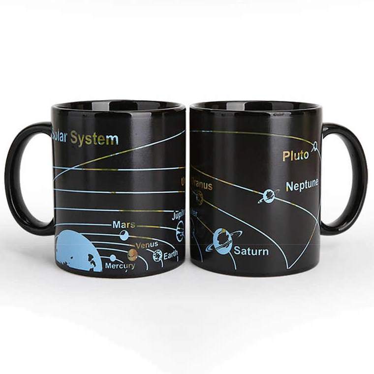 Кружка-хамелеон для любителей космических путешествий, а так же путешественников. Возьмите ее с собой и у вас всегда будет карта солнечной системы и нашей планеты. Стоит только налить в неё горячей жидкости, и кружка поменяет рисунок с картой Солнечной системы на карту Земли.