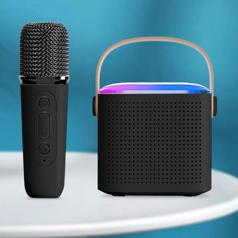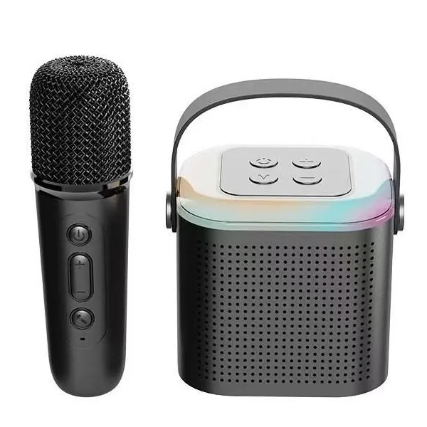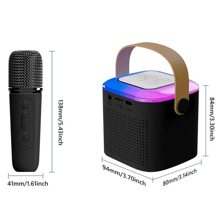 Мини колонка, беспроводной микрофон, индивидуальная регулировка громкости для каждого, выход для наушников, слот под micro-SD карту памяти, акустика и микрофон работает от встроенного аккумулятора, удобная ручка для транспортировки.На верхней панели колонки расположены 4 кнопки: 1,2. увеличение/уменьшение громкости или, при удержании, переход к следующему/предыдущему треку; 3. кнопка включения/выключения или при однократном нажатии воспроизведение/пауза трека; 4. кнопка M, которая отвечает за переключение между разъёмами Bluetooth, AUX, micro-SD картой памяти или, при двойном нажатии на эту кнопку, сменяется цвет и ритм подсветки, для отключения подсветки нажмите и удерживайте несколько секунд эту кнопку. При воспроизведении трека подсветку можно только отключить или включить один вариант. На задней панели расположены: выход джек 3.5 мм. для наушников или более мощную акустику, вход под карту памяти micro-SD для воспроизведения аудио файлов, гнездо для зарядки акустики Type-C. Удобная ручка для транспортировки выполнена из ЭКО кожи коричневого цвета. Сам динамик выполнен из прочного пластика.