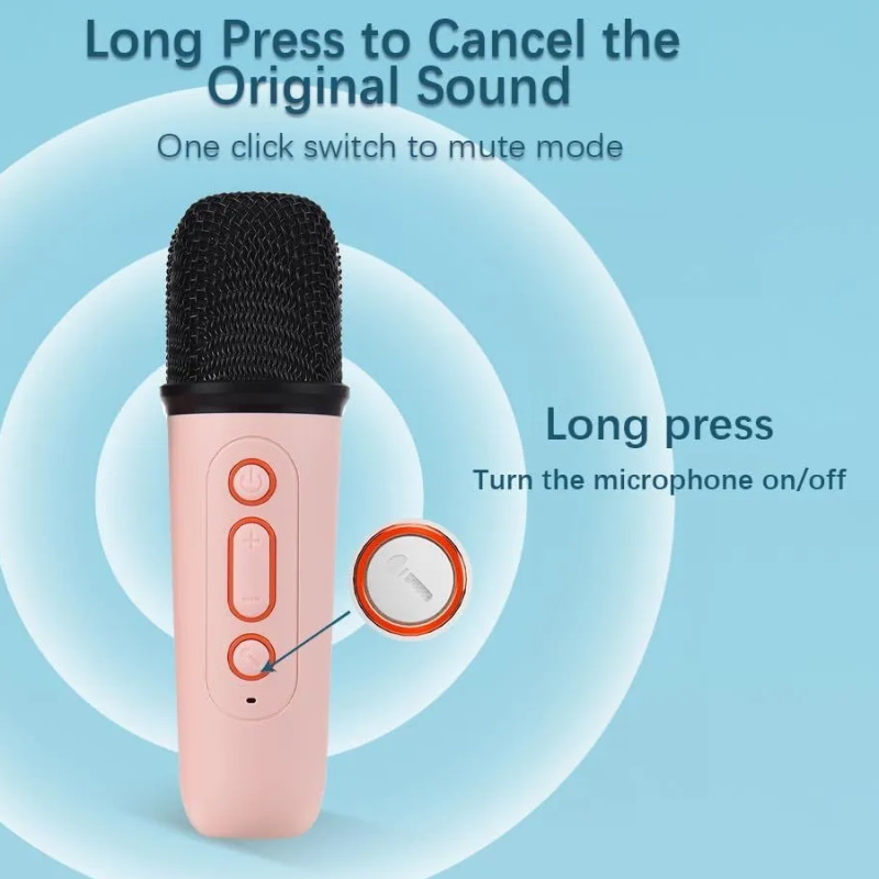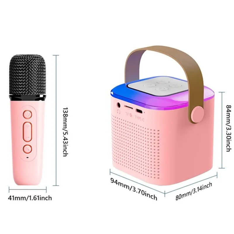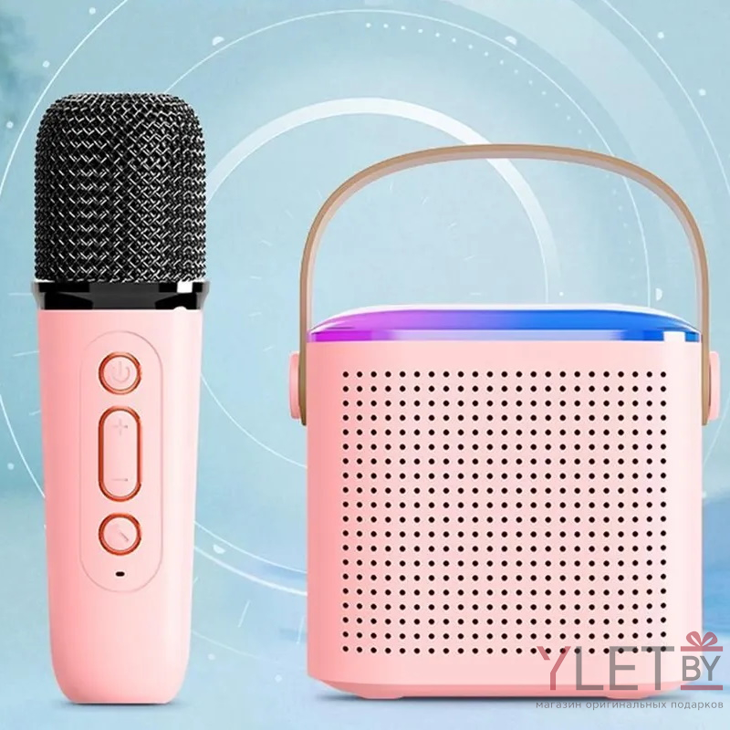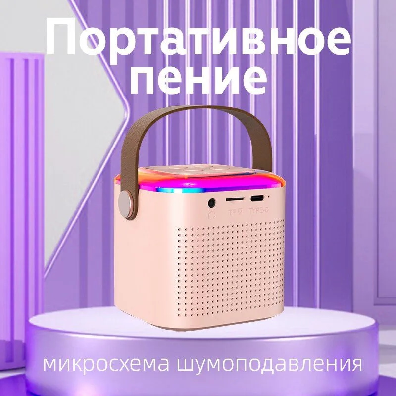 Мини колонка, беспроводной микрофон, индивидуальная регулировка громкости для каждого, выход для наушников, слот под micro-SD карту памяти, акустика и микрофон работает от встроенного аккумулятора, удобная ручка для транспортировки.На верхней панели колонки расположены 4 кнопки: 1,2. увеличение/уменьшение громкости или, при удержании, переход к следующему/предыдущему треку; 3. кнопка включения/выключения или при однократном нажатии воспроизведение/пауза трека; 4. кнопка M, которая отвечает за переключение между разъёмами Bluetooth, AUX, micro-SD картой памяти или, при двойном нажатии на эту кнопку, сменяется цвет и ритм подсветки, для отключения подсветки нажмите и удерживайте несколько секунд эту кнопку. При воспроизведении трека подсветку можно только отключить или включить один вариант. На задней панели расположены: выход джек 3.5 мм. для наушников или более мощную акустику, вход под карту памяти micro-SD для воспроизведения аудио файлов, гнездо для зарядки акустики Type-C. Удобная ручка для транспортировки выполнена из ЭКО кожи коричневого цвета. Сам динамик выполнен из прочного пластика.