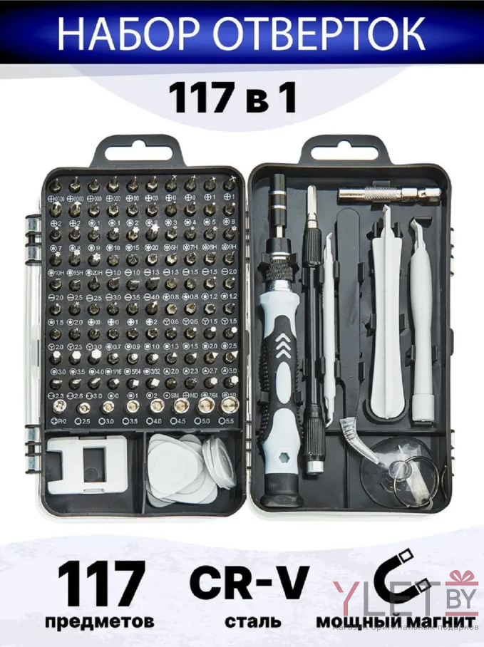 - Широкий ассортимент бит: Набор включает 117 различных бит, которые подходят для большинства стандартных винтов и шурупов. Вы сможете легко справиться со всеми видами работы — от ремонта электроники до сборки мебели.