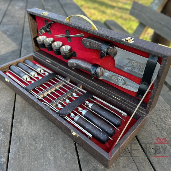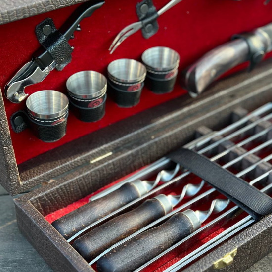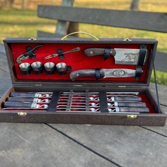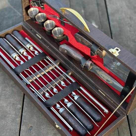 Подарочный шашлычный набор станет достойным презентом для близких, друзей, партнёров и руководителя. Мы предлагаем шашлычные наборы отличного качества, которые будут радовать Вас на протяжении долгих лет. Шашлычный набор стoит купить мужу, друзьям, начaльнику - шeфу или коллеге пo рaбoте!Комплектация:
