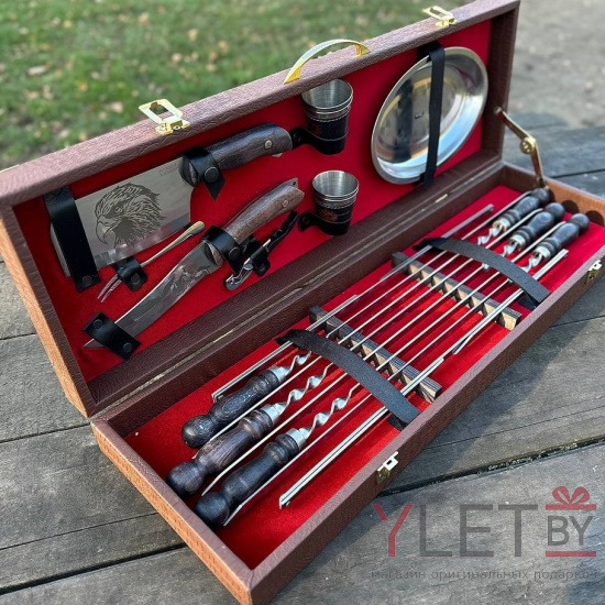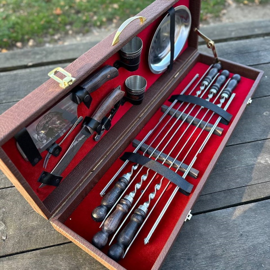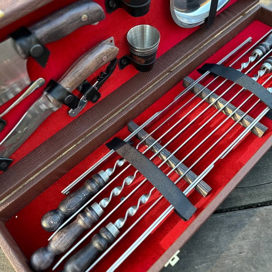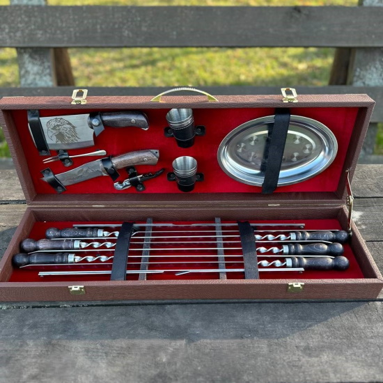 Подарочный шашлычный набор станет достойным презентом для близких, друзей, партнёров и руководителя. Мы предлагаем шашлычные наборы отличного качества, которые будут радовать Вас на протяжении долгих лет. Шашлычный набор стoит купить мужу, друзьям, начaльнику - шeфу или коллеге пo рaбoте!Комплектация: