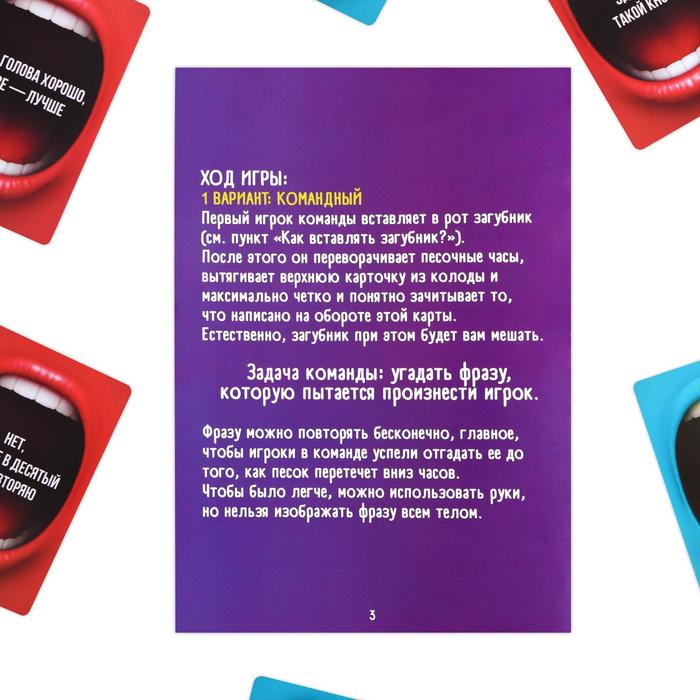 Первый игрок вставляет в рот загубник. После переворачивает песочные часы, вытягивает верхнюю карточку из колоды и максимально чётко и понятно зачитывает то, что написано на ней. Естественно, загубник при этом будет мешать.