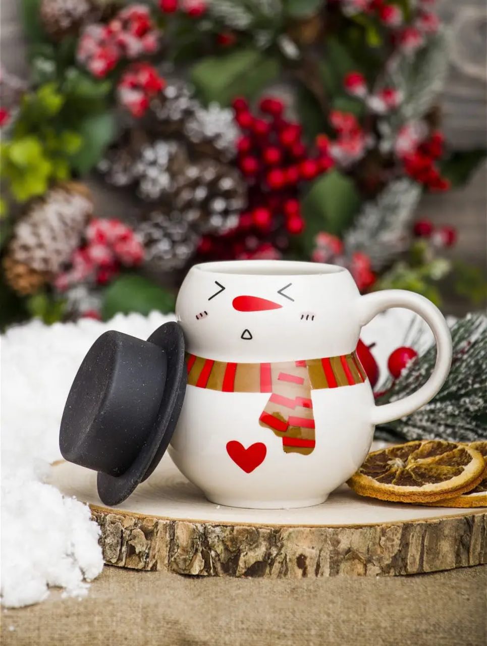 - Уникальный дизайн: Кружка выполнена в виде милого снеговика с яркой шляпой и нарядным украшением. Веселое выражение лица снеговика добавляет хорошего настроения и создает атмосферу праздника.
