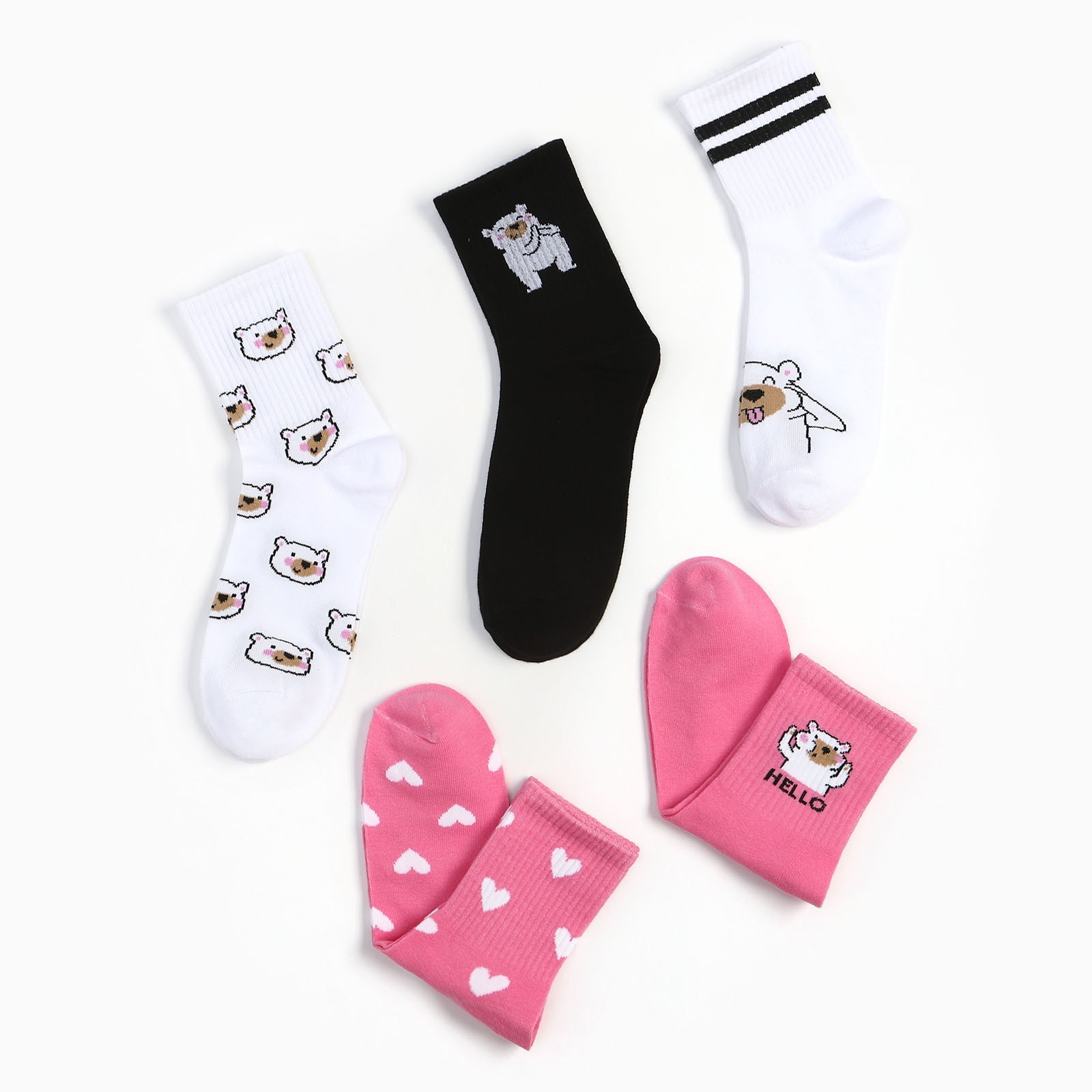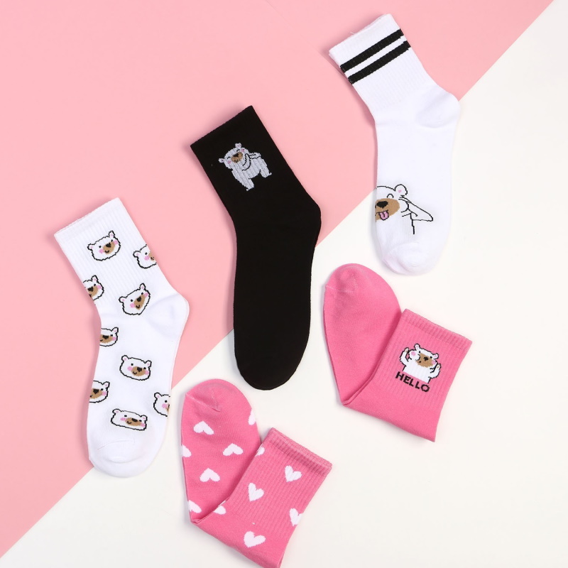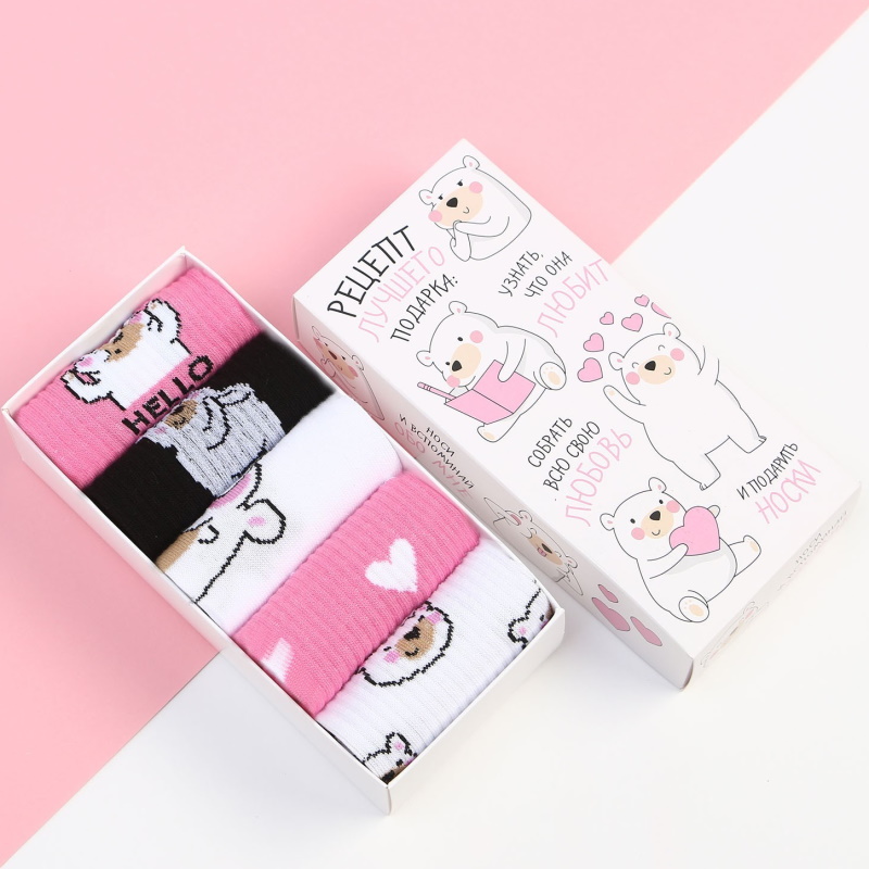 Женские носки набор из пяти высоких пар порадуют своим разнообразием и оригинальностью. Они выполнены в спортивном стиле с милыми принтами, среди которых изображение забавных медведей.