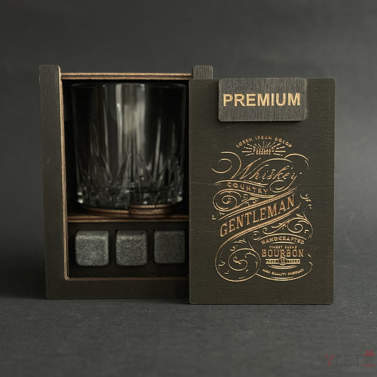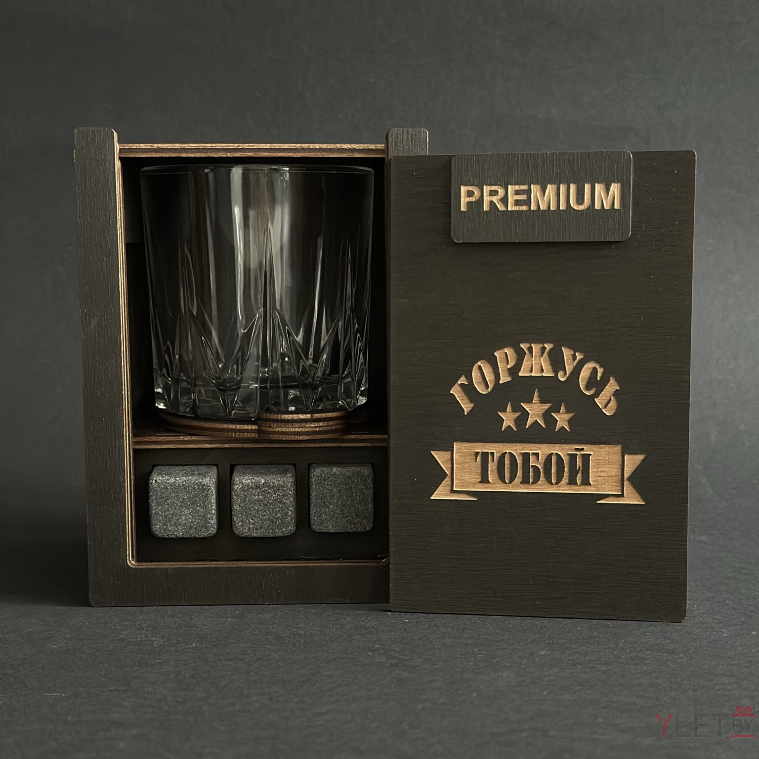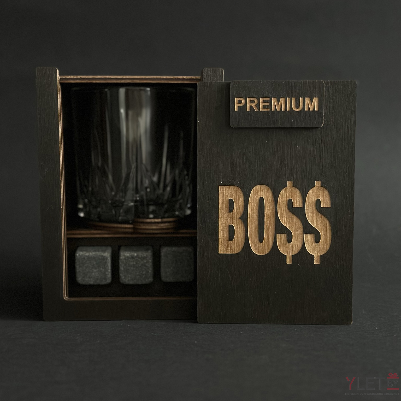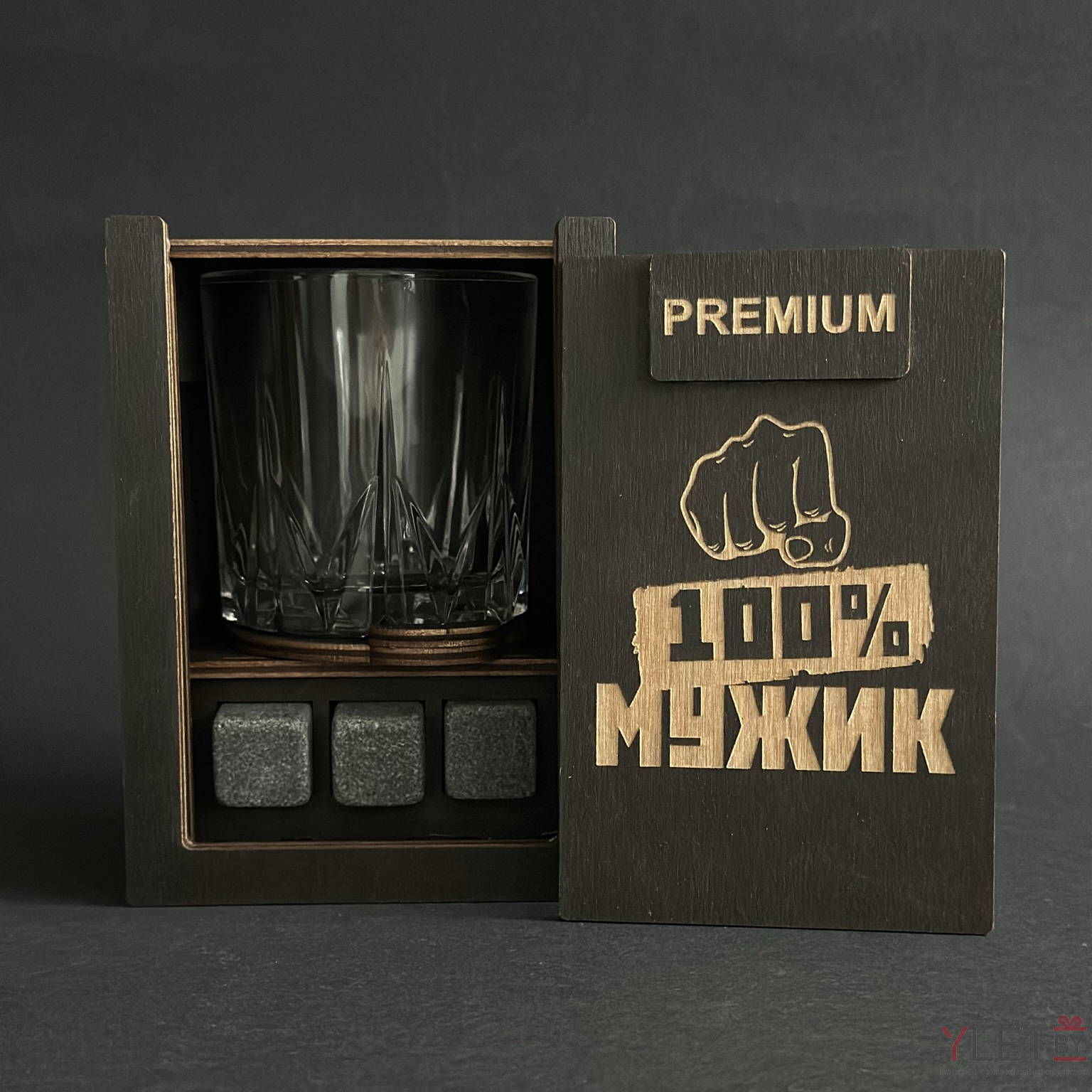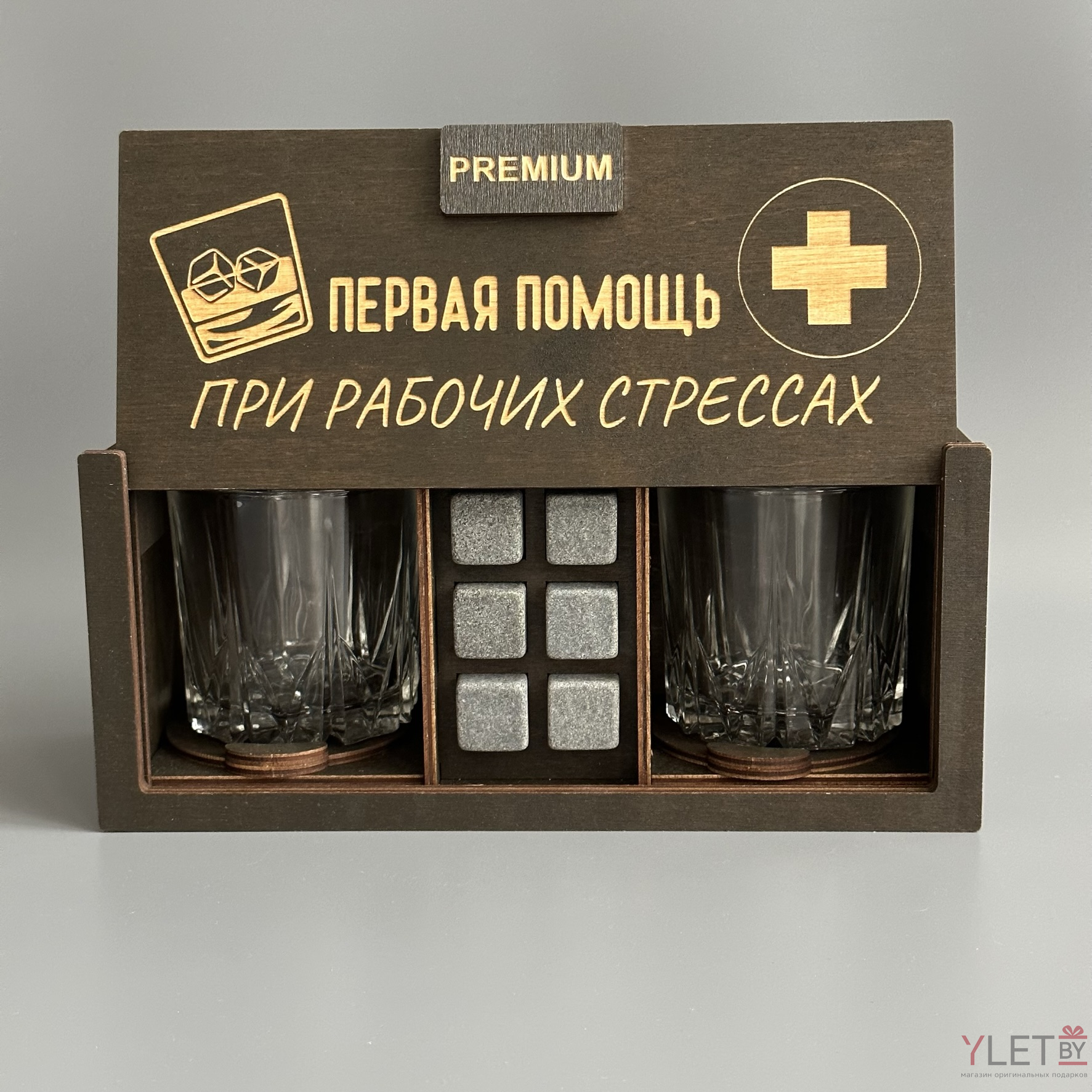 Набор для виски Premium “ Первая помощь при рабочих стрессах ” (2 стакана + 6 камней + 2 подставки )