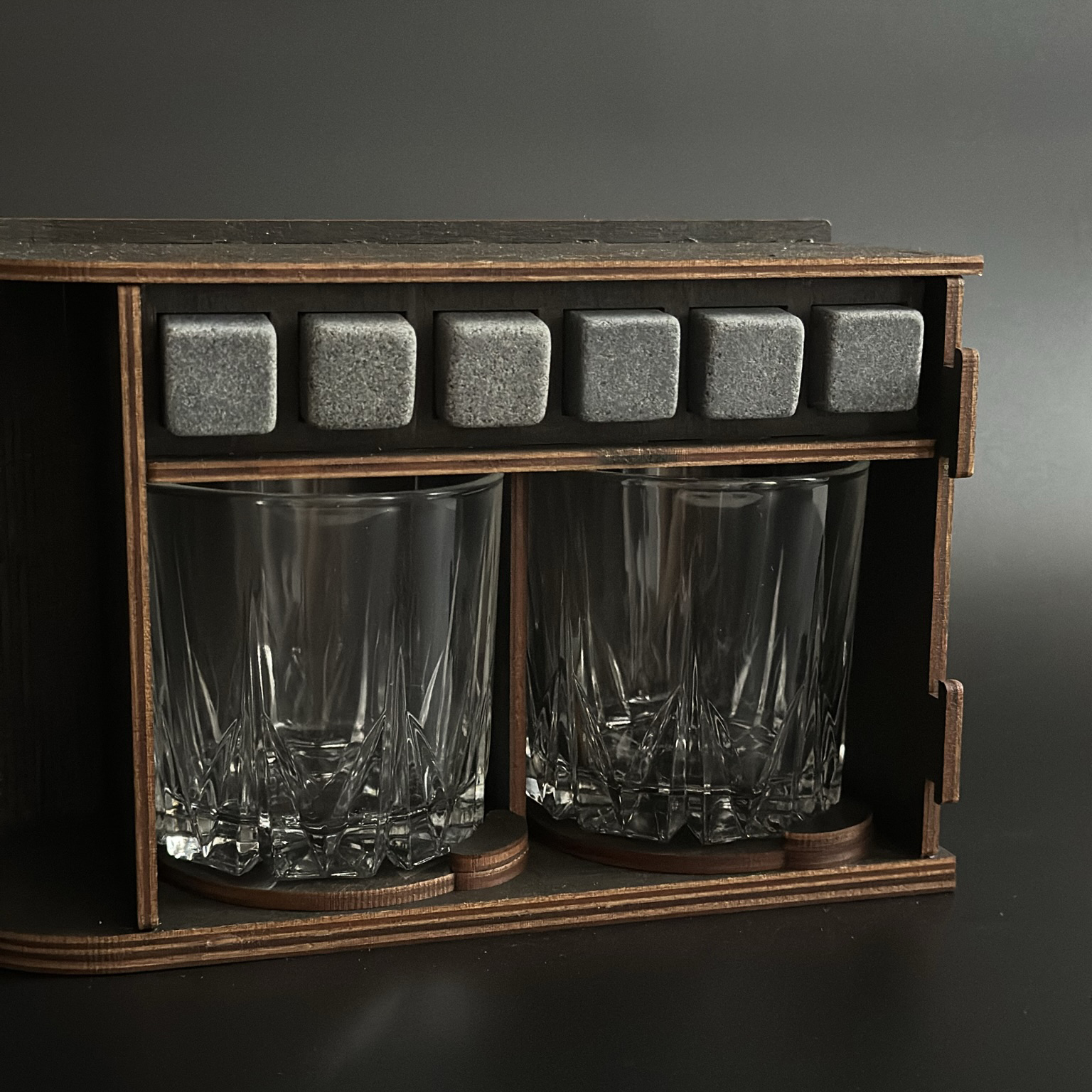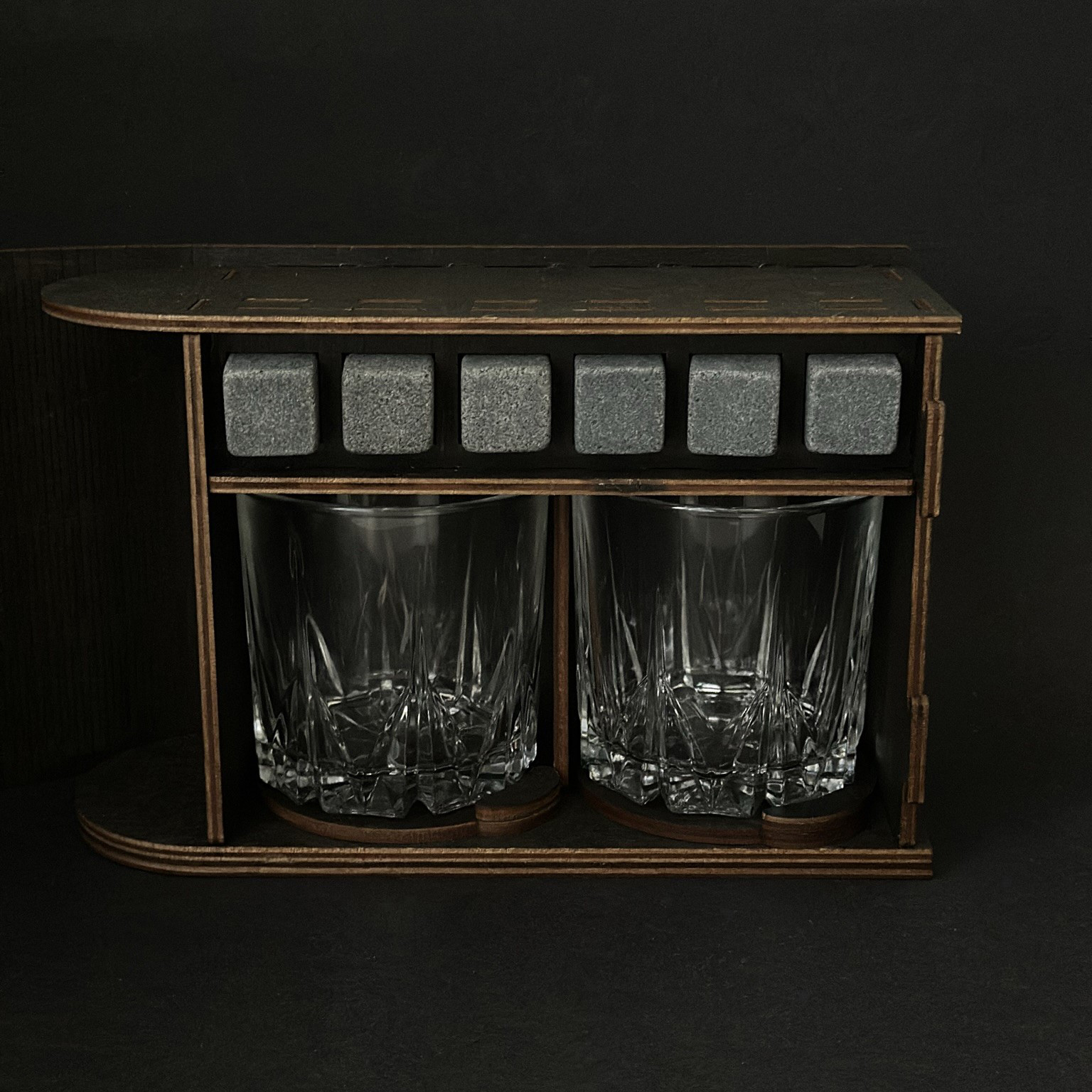 - 2 стакана: Изготовленные из высококачественного стекла, стаканы имеют классическую форму и прекрасно подчеркивают цвет и текстуру вашего любимого виски. Удобная форма обеспечивает комфорт при питье.