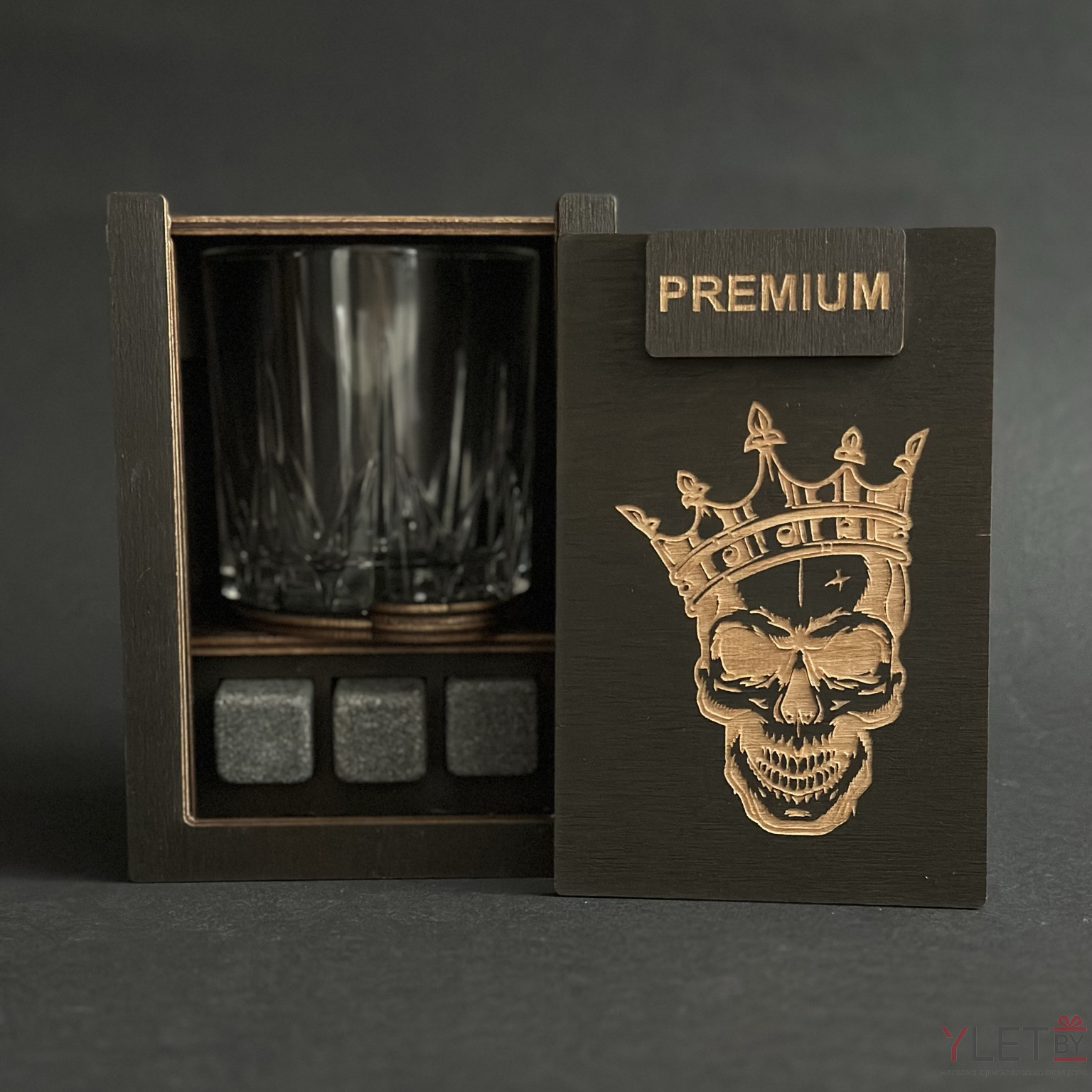 Набор для виски Premium «Череп с короной » (cтакан + 3 камня)