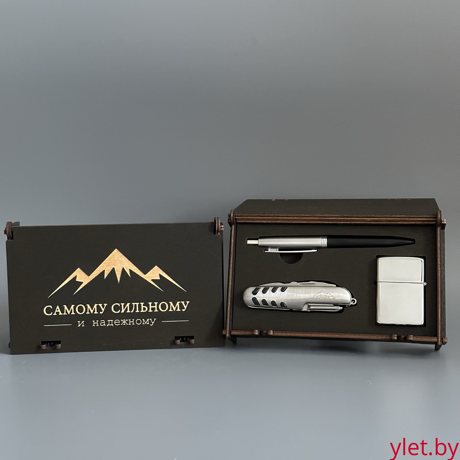 Подарочный набор "Самому сильному и надежному" горы (Ручка, бензиновая зажигалка, мультитул)
