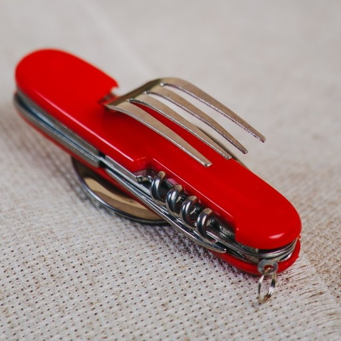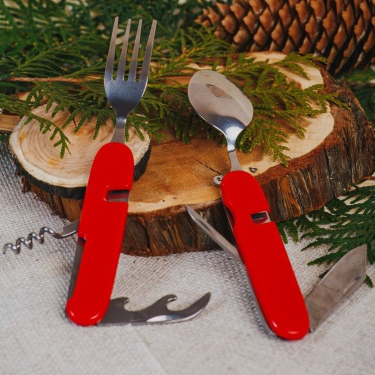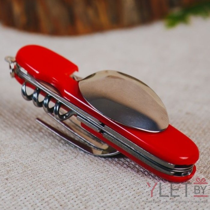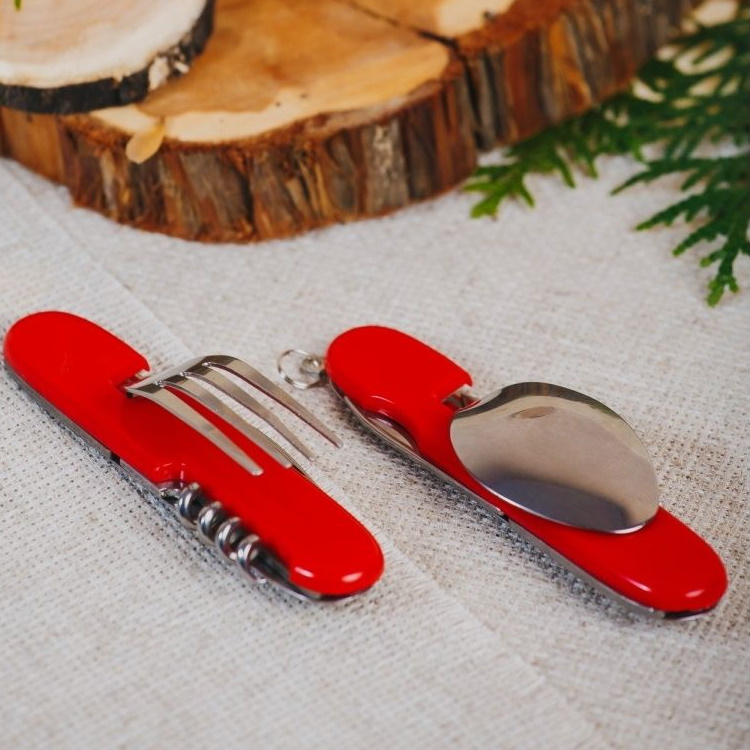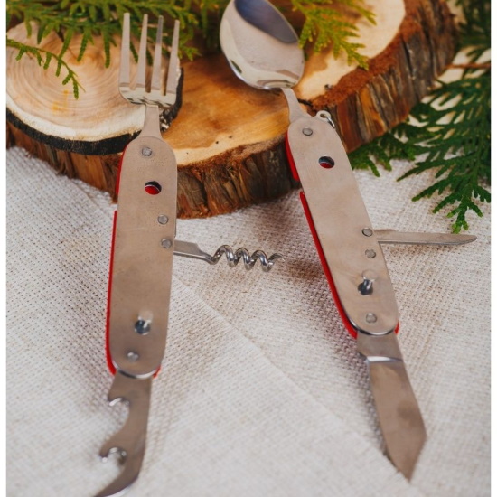Мультитул походный Ложка+вилка состоит из набора предметов. Цвет пластикового обрамления корпуса - красный. Количество предметов - 6 инструментов. Включающих ложку, вилку, нож, штопор, шило и консервный нож. Изготовлен из прочного металла.