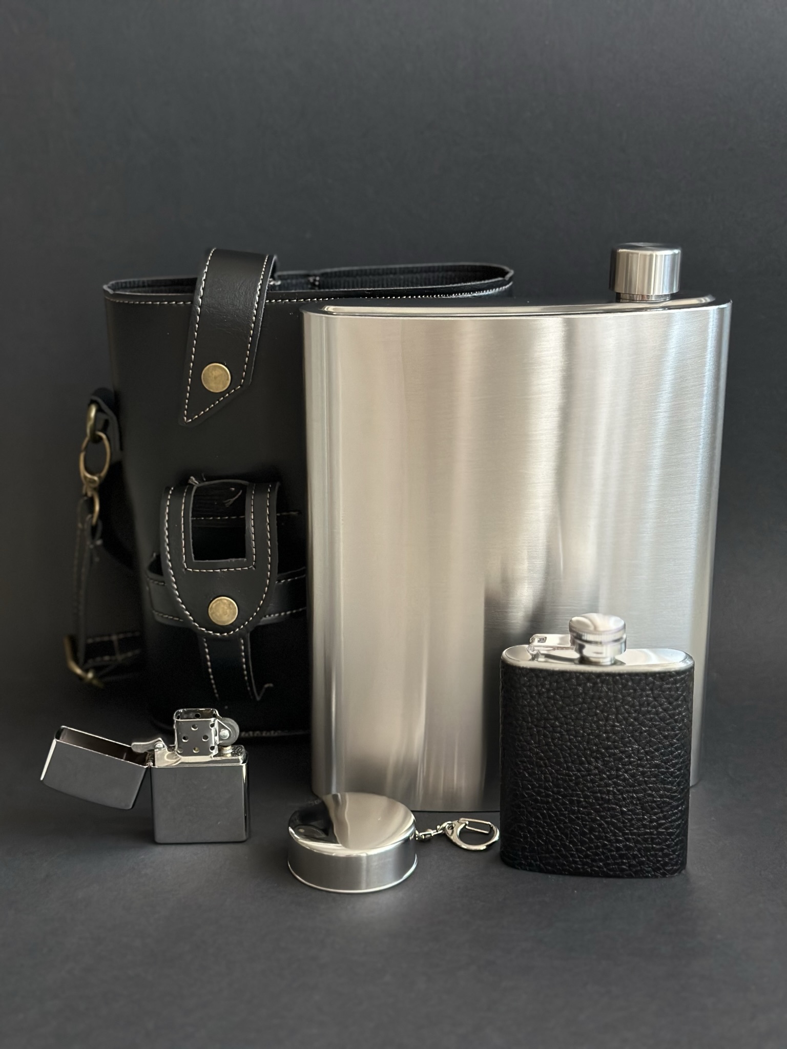 Набор походный 4 предмета черный (фляжка 1,4 литра, фляжка 120 мл, зажигалка бензиновая, складная стопка, ремень для переноски)