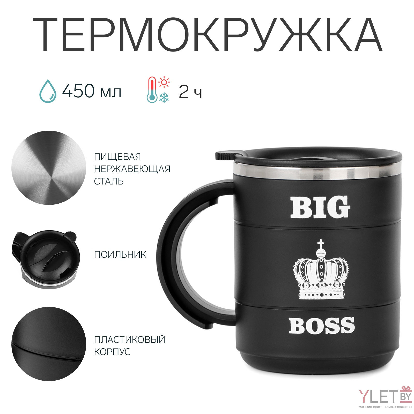 Представляем термокружку "BIG BOSS" — сочетание функциональности и стиля для настоящих лидеров. Изготовленная из высокопрочной нержавеющей стали, она сохраняет температуру ваших любимых напитков до 2 часов, позволяя наслаждаться любимыми горячими либо холодными напитками в любое время.