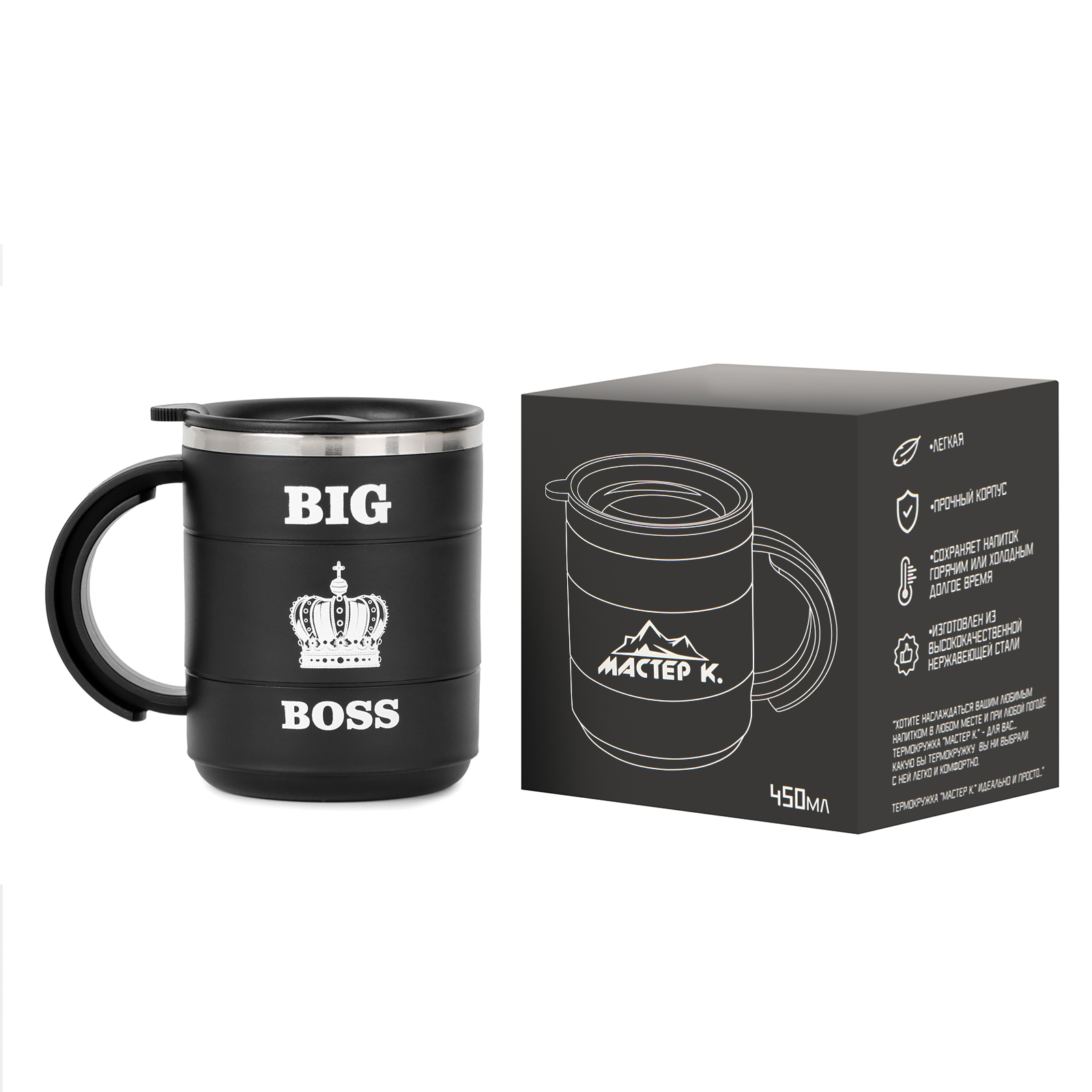 С термокружкой "BIG BOSS" ваши напитки всегда будут под рукой, а стильный и современный дизайн подчеркнет вашу уверенность и статус. Наслаждайтесь каждым моментом и стилем жизни!