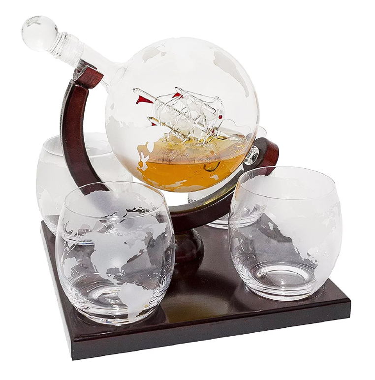 Внутри стеклянного глобуса расположился парусный корабль, выполненный с предельным вниманием к деталям. Этот элемент ручной работы добавляет нотку романтики и свидетельствует о вашей любви к морю и приключениям. Декантер декорирован картой мира, что делает его не только функциональным предметом, но и стильным аксессуаром.