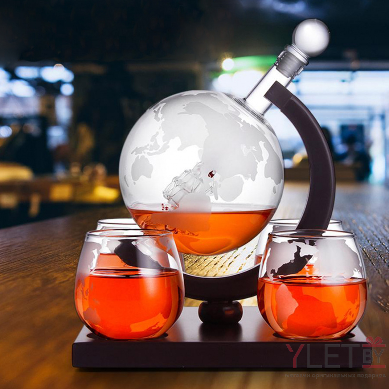 Набор для виски подарочный 4 стакана и графин "Глобус" на подставке