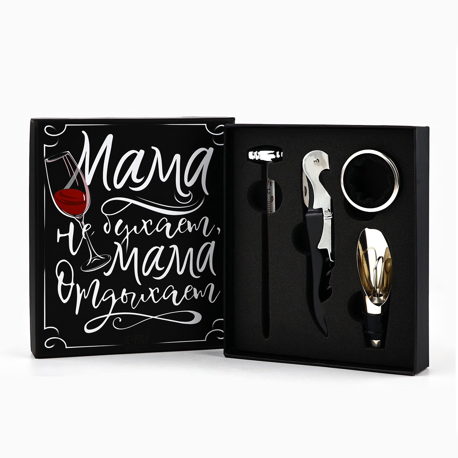 Подарочный винный набор: штопор для вина, аэратор, каплеуловитель, термометр «Мама отдыхает»